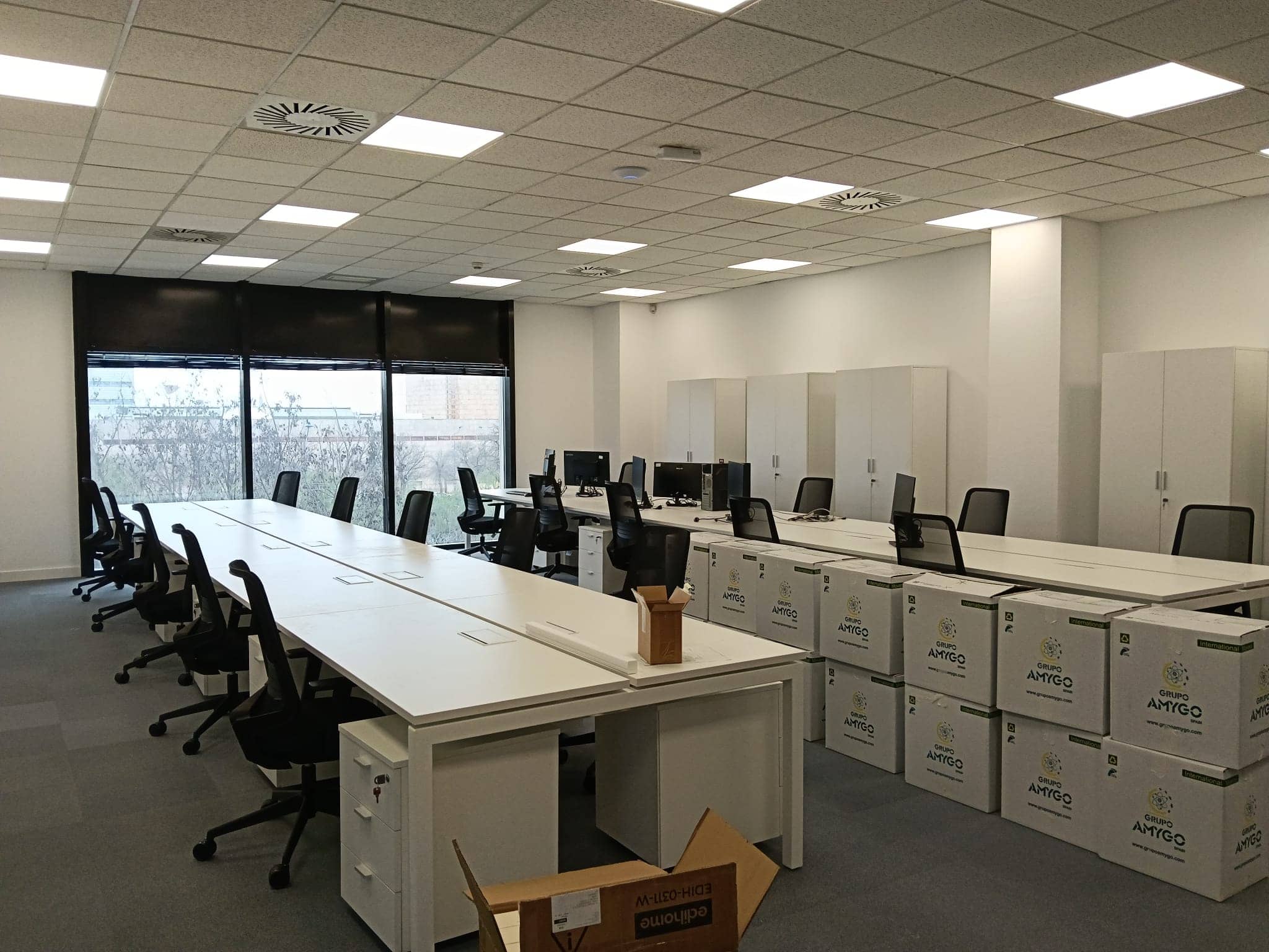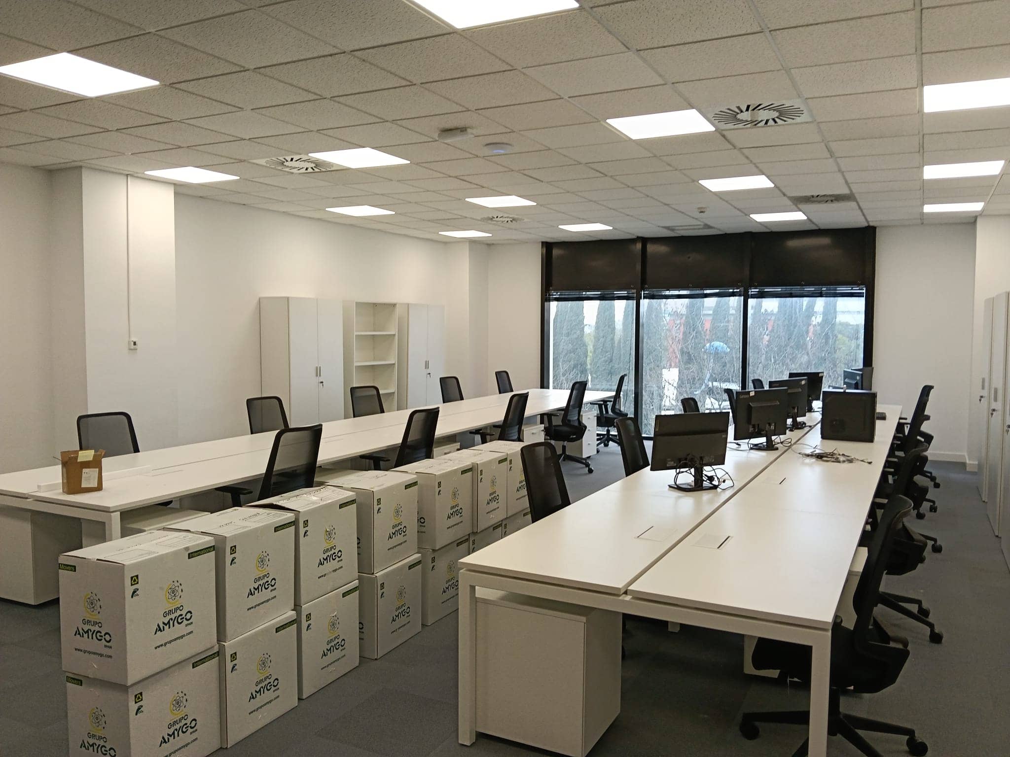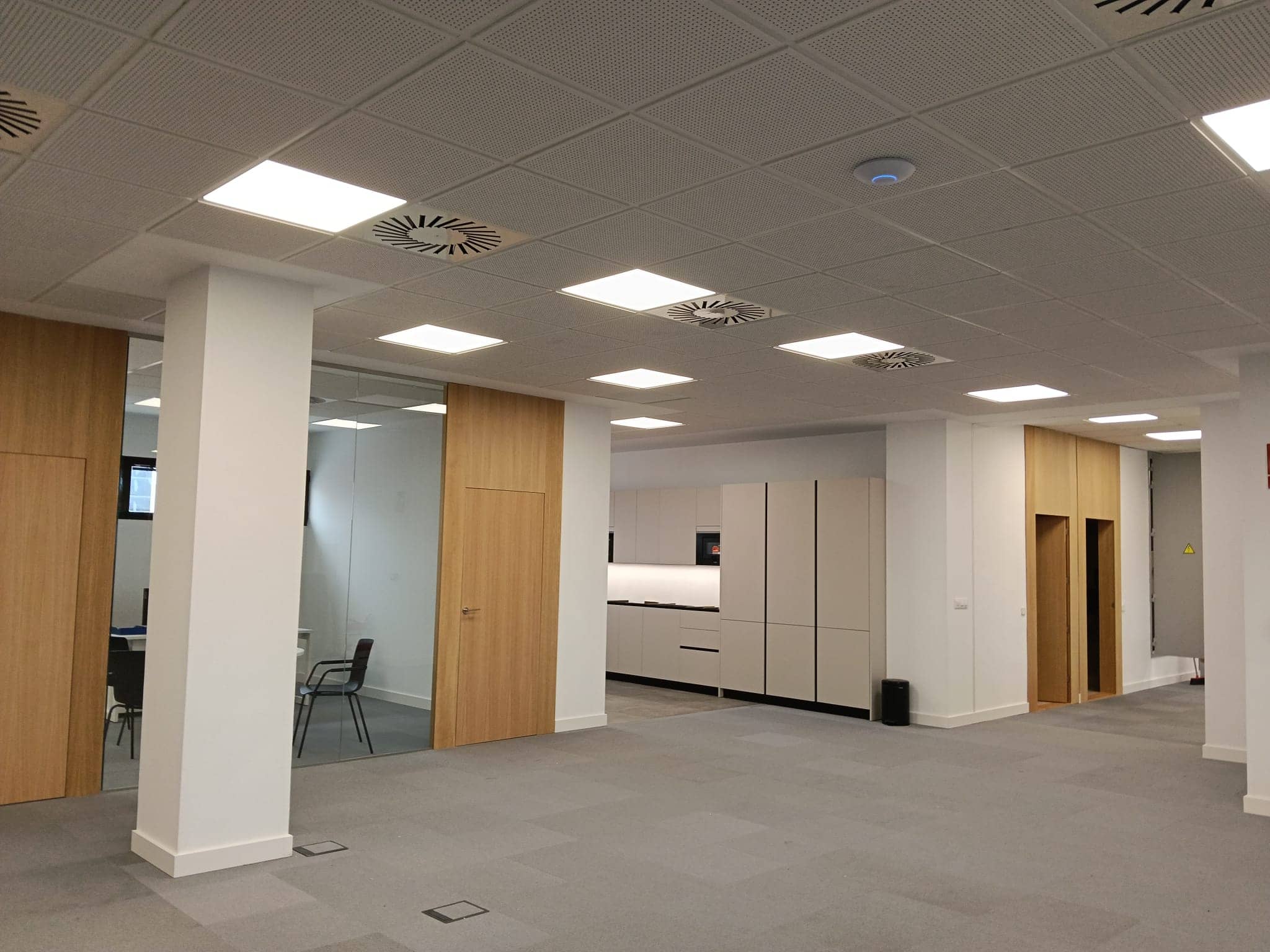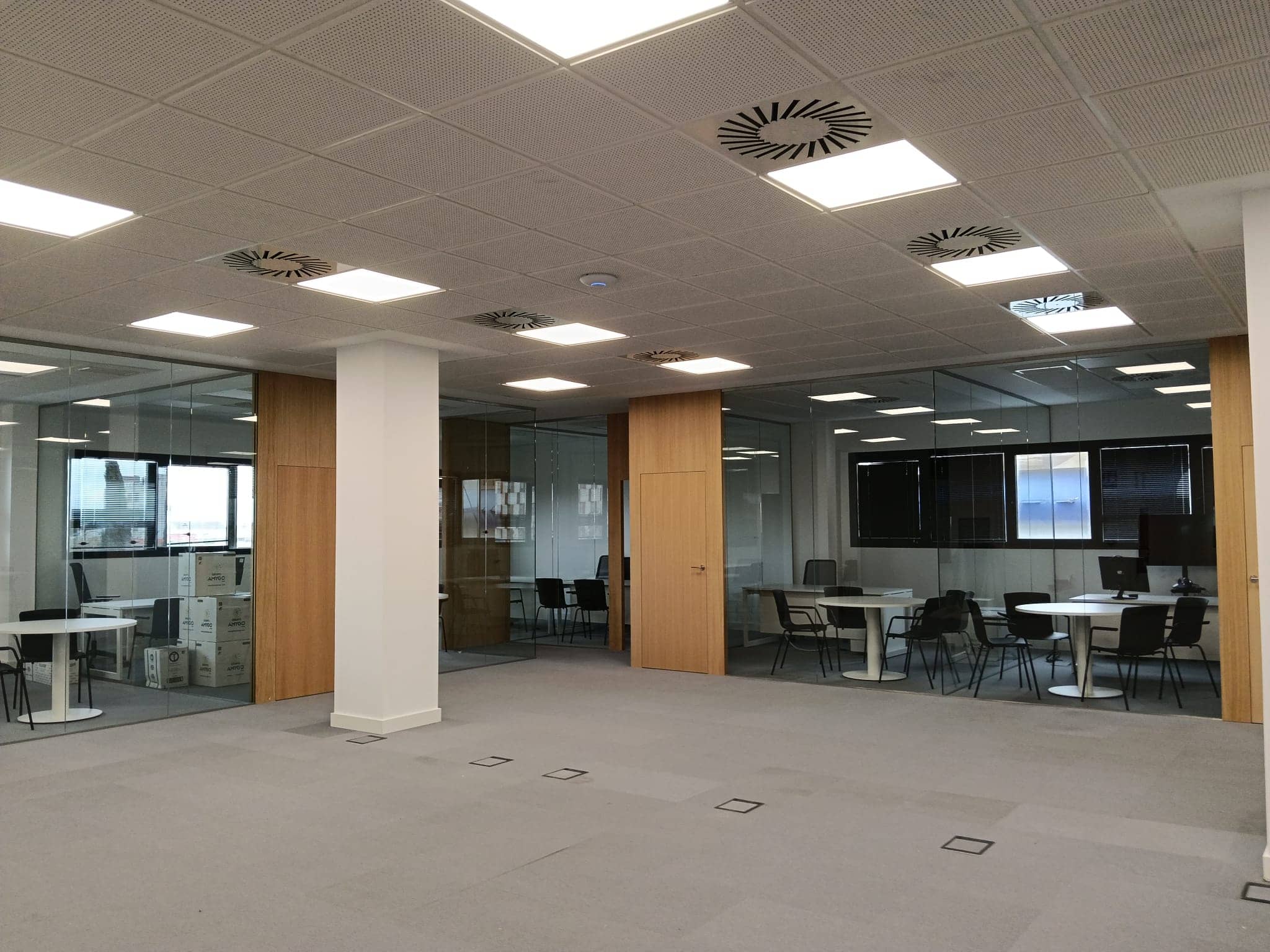 Instalación de bandejas de canalización en suelo técnico y puestos de trabajo empotrados en suelo técnico.