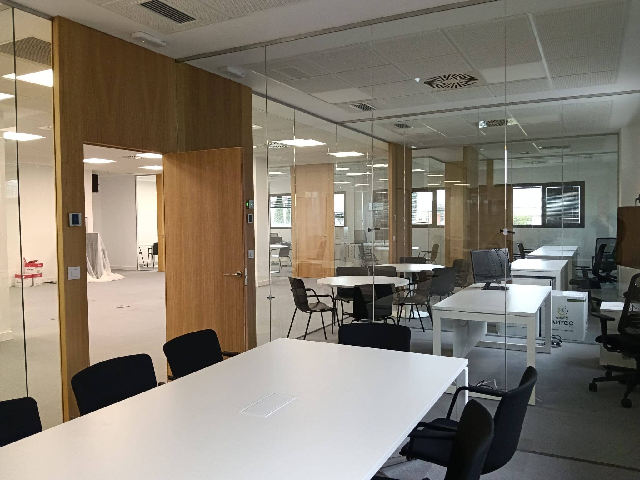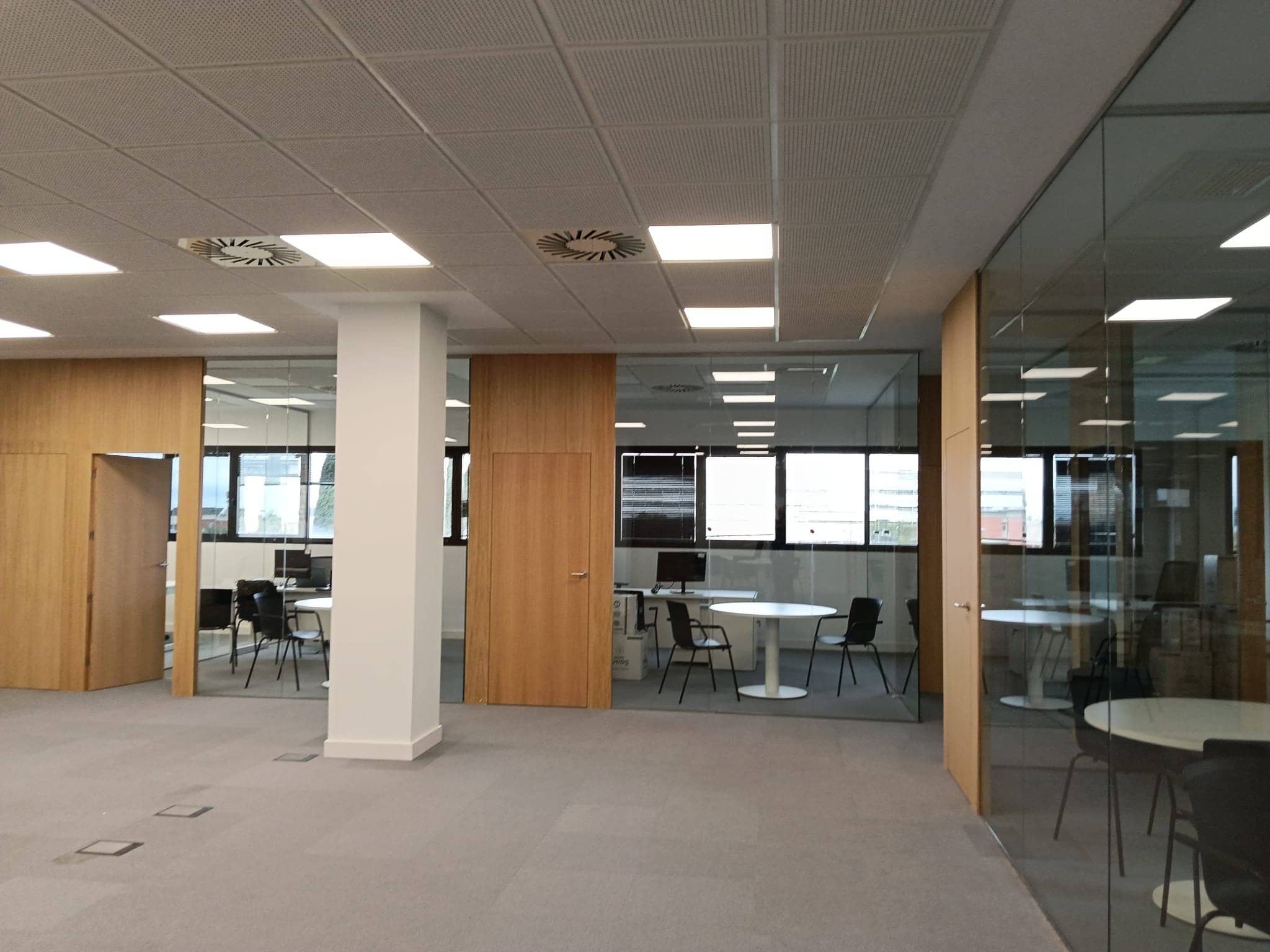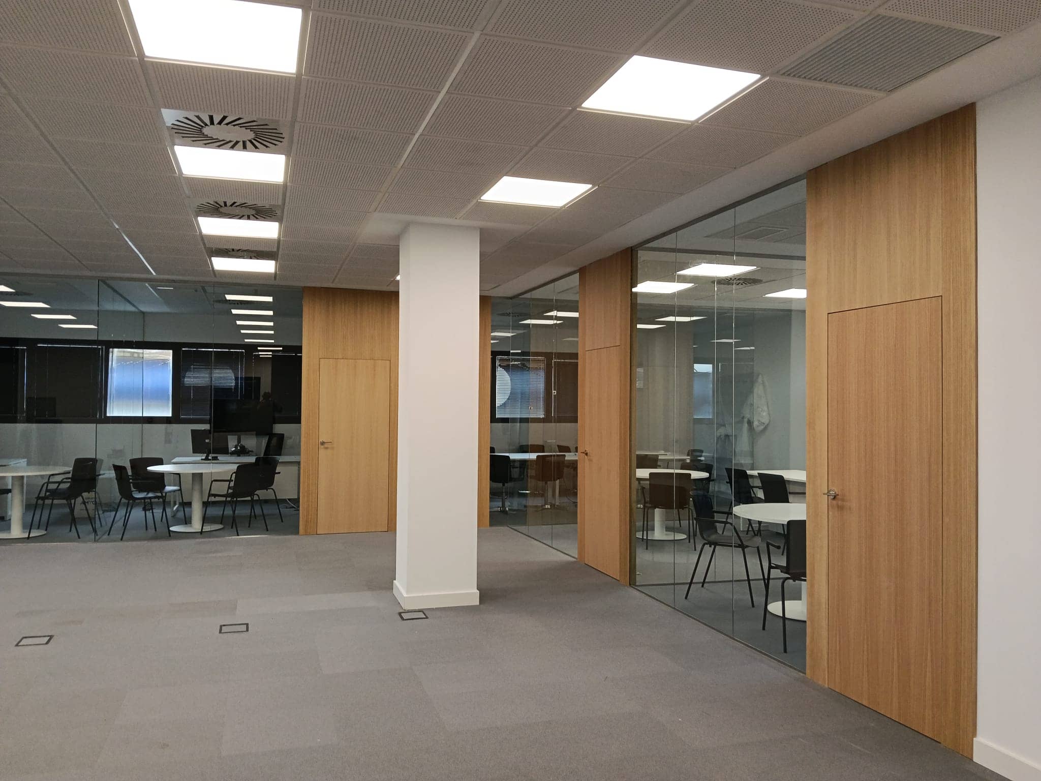 Instalación de bandejas de canalización en suelo técnico y puestos de trabajo empotrados en suelo técnico.