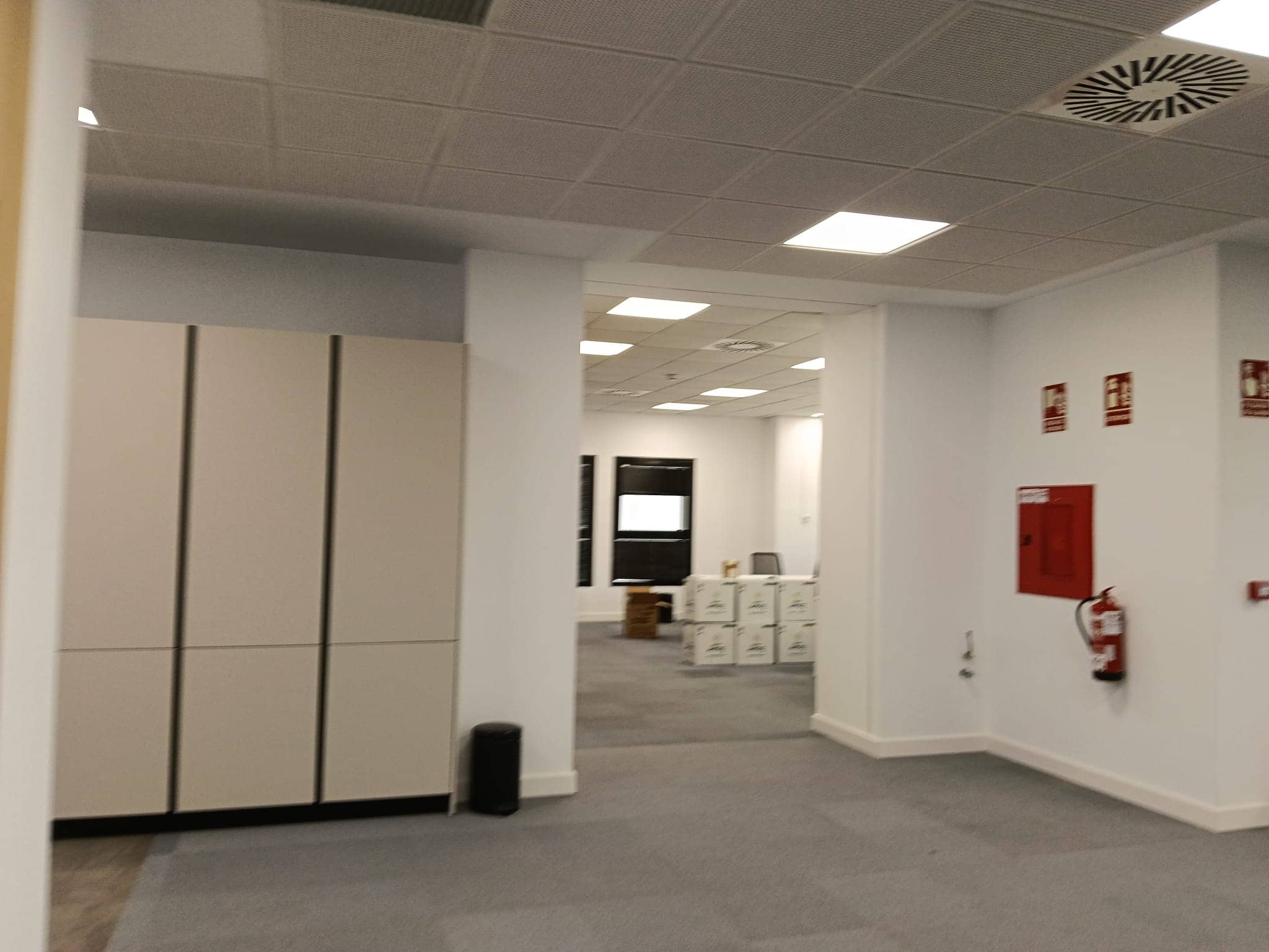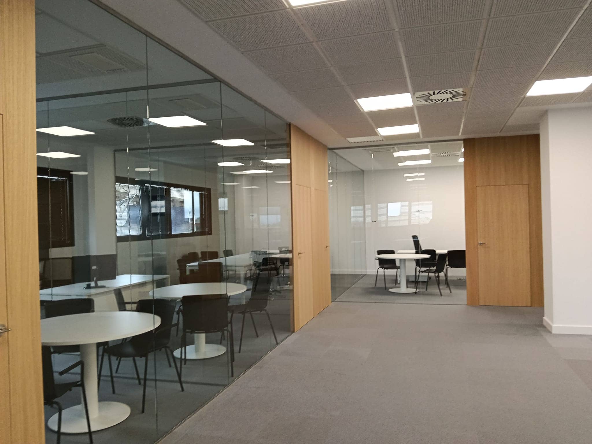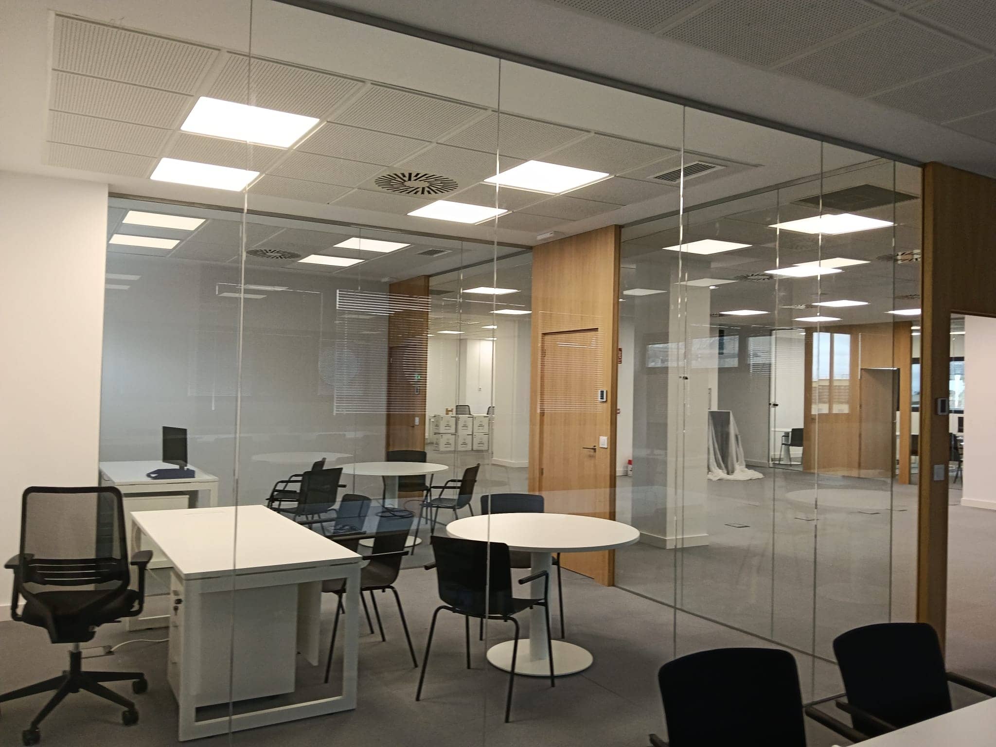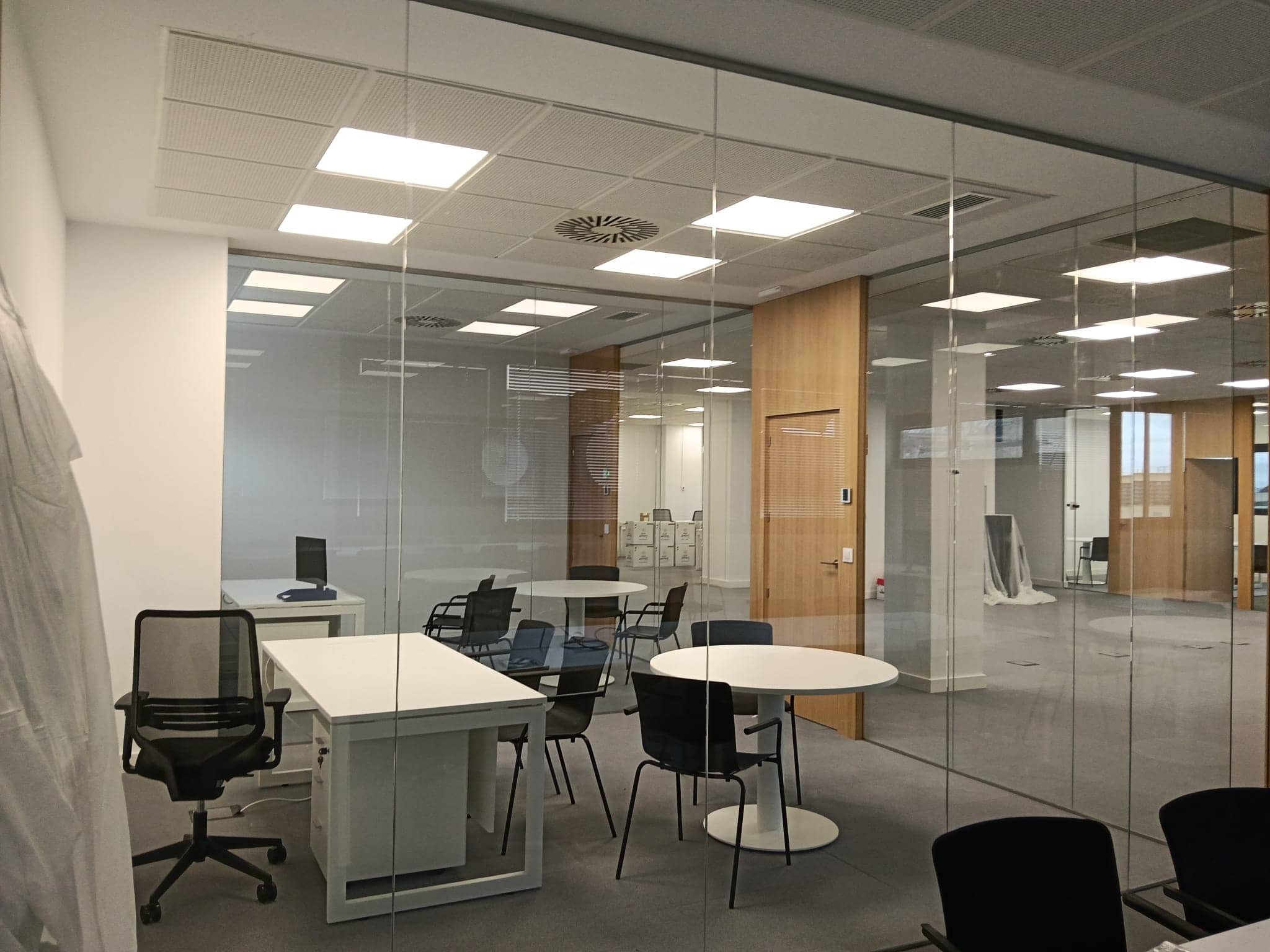 Instalación de bandejas de canalización en suelo técnico y puestos de trabajo empotrados en suelo técnico.